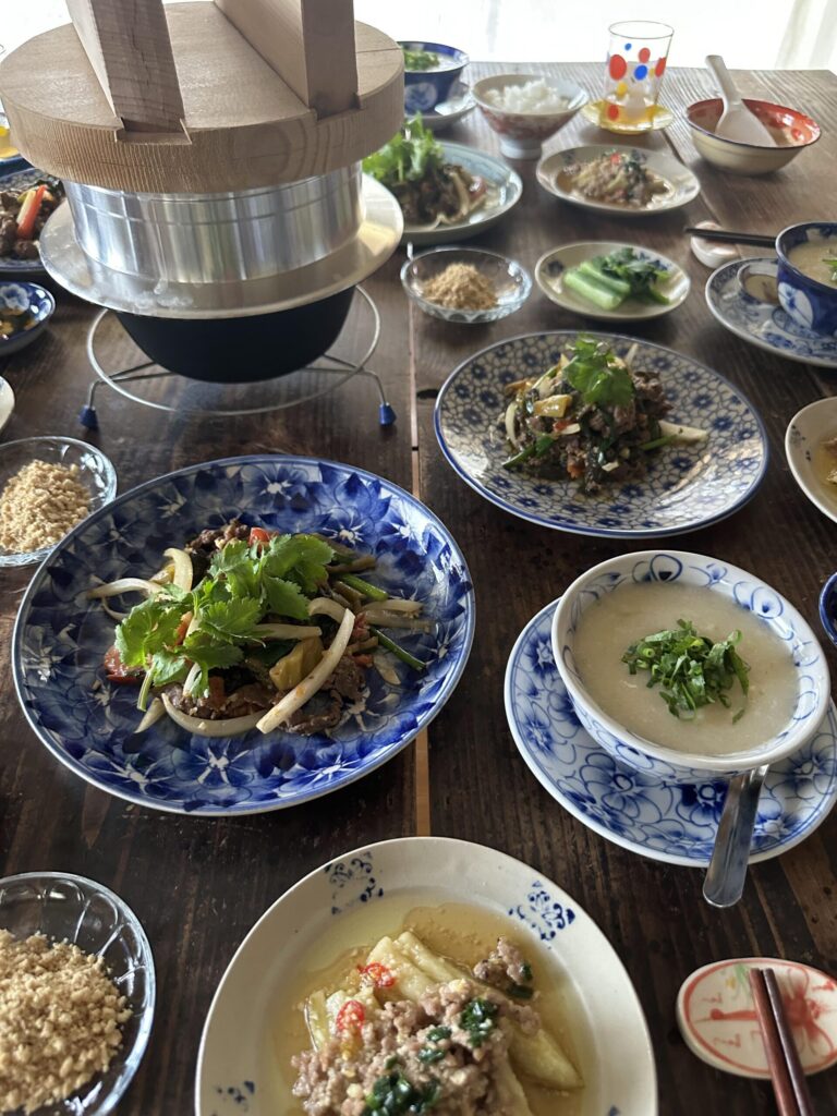 メニュー:ウエルカムドリンク/牛肉と高菜の炒め物/焼きナス/茹で青菜とごまピーナッツ塩だれ/長芋とたたき海老のスープ/かもはら農園魚沼産コシヒカリ(新米)/お芋とバナナのチェー/ベトナムコーヒー